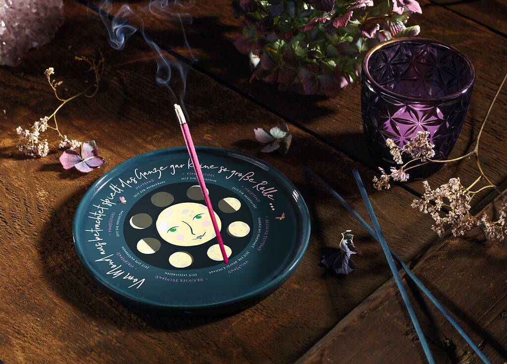 Ob beim Meditieren, während deiner Yoga-Praxis oder einfach für einen Moment der Stille – der Räucherteller „Mondphasen" schafft einen achtsamen Raum für kleine Rituale. Das liebevoll illustrierte Mondgesicht inmitten der wechselnden Phasen erinnert daran, dass alles im Wandel ist – und lädt dazu ein, im Hier und Jetzt anzukommen.