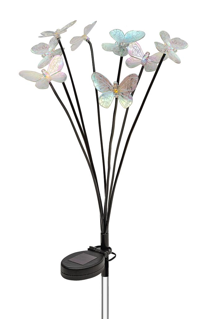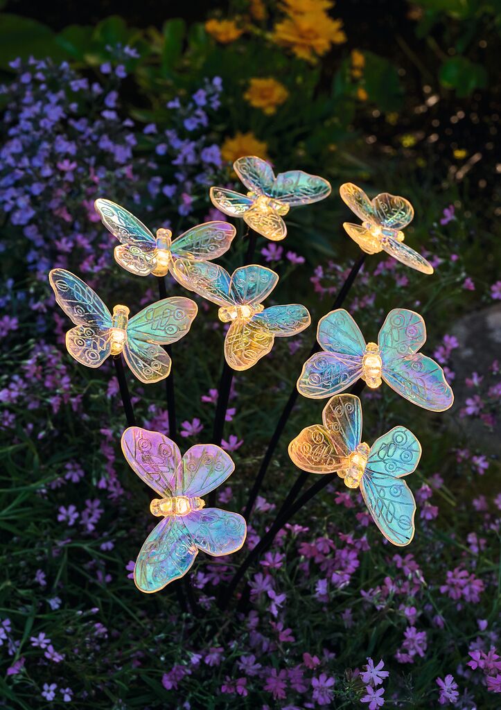 Acht zarte Schmetterlinge tanzen auf filigranen Stäben im Wind und leuchten bei Dunkelheit in warmem Licht – ganz ohne Strom. Das integrierte Solarpanel lädt sich tagsüber auf und bringt bei Einbruch der Dämmerung die LED-Leuchten zum Strahlen.