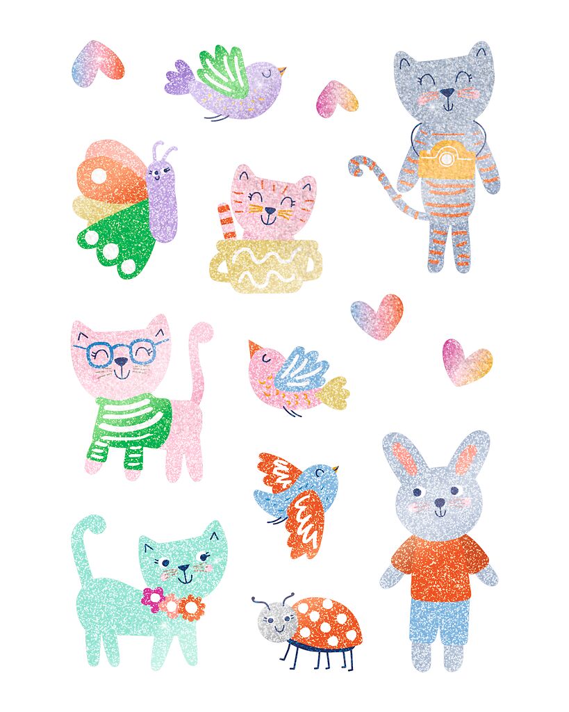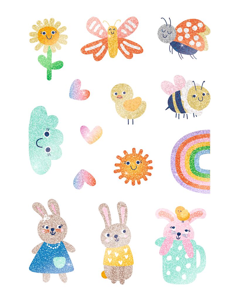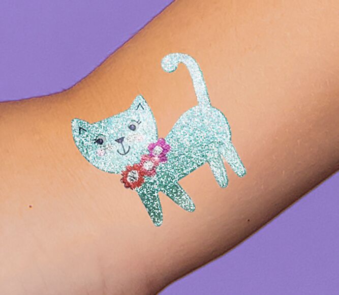 Dieses Set enthält 28 liebevoll gestaltete Tattoos auf zwei Bögen. Die kindgerechten Motive wie Tiere, Blumen und Regenbögen lassen sich leicht auftragen und sorgen für glitzernde Highlights auf der Haut.