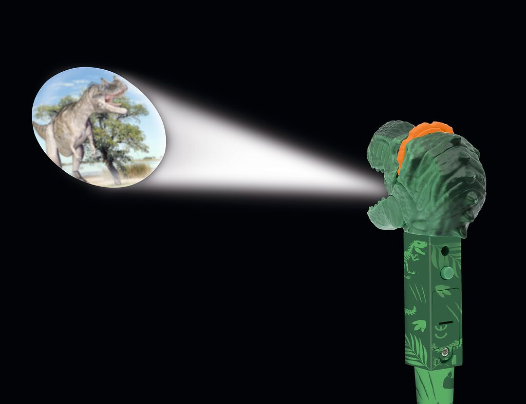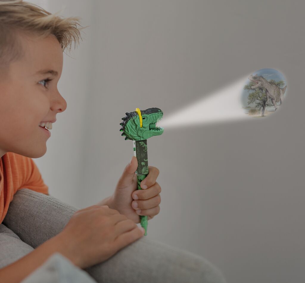Mit diesem Dino-Projektor-Stift geht es auf eine spannende Reise in die Urzeit. Einfach die beiliegenden Bildscheiben einsetzen und schon erscheinen T-Rex, Triceratops und Co. als leuchtende Projektionen an der Wand. Gleichzeitig ist der Stift ein voll funktionsfähiger Kugelschreiber – ideal für kleine Dino-Fans, die gerne schreiben und entdecken.