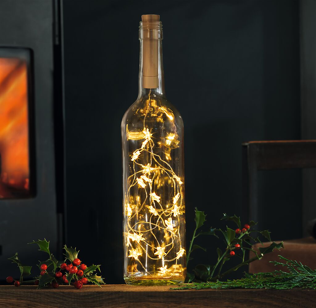 Wie wäre es, die leere Weinflasche in ein strahlendes Herzstück für den Weihnachtsabend zu verwandeln oder mal einen kreativen Adventskranz mit leuchtenden Flaschen anstatt Kerzen zu gestalten? Mit unserem Flaschenlicht Sternenglanz ist das ganz einfach möglich! Leere Flaschen müssen nicht gleich entsorgt werden – nutze sie doch als zauberhafte Dekoration. Einfach eine leere Flasche nehmen, das Flaschenlicht in die Öffnung stecken, Licht anschalten und schon strahlt sie festlich. Dekoriere damit doch den Weihnachtstisch und sorge mit den 20 warmweißen LEDs mit Sternenaufsatz für eine warme, einladende Beleuchtung.