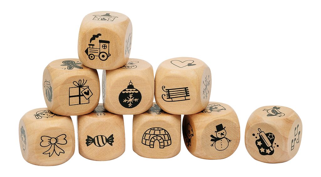 Das Set enthält 9 große Holzwürfel mit winterlichen Symbolen, die allein oder gemeinsam genutzt werden können. Verpackt in einer dekorativen Box mit Goldfolien-Veredelung sind die Würfel eine stimmungsvolle Beschäftigungsidee für die Winter- und Weihnachtszeit.