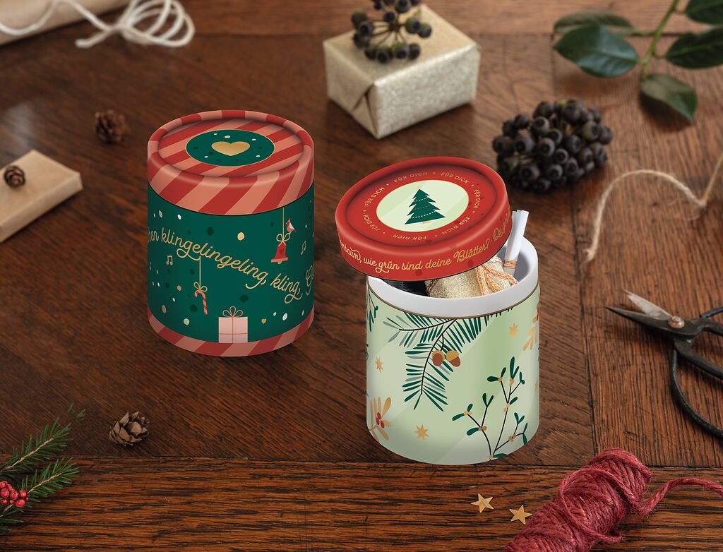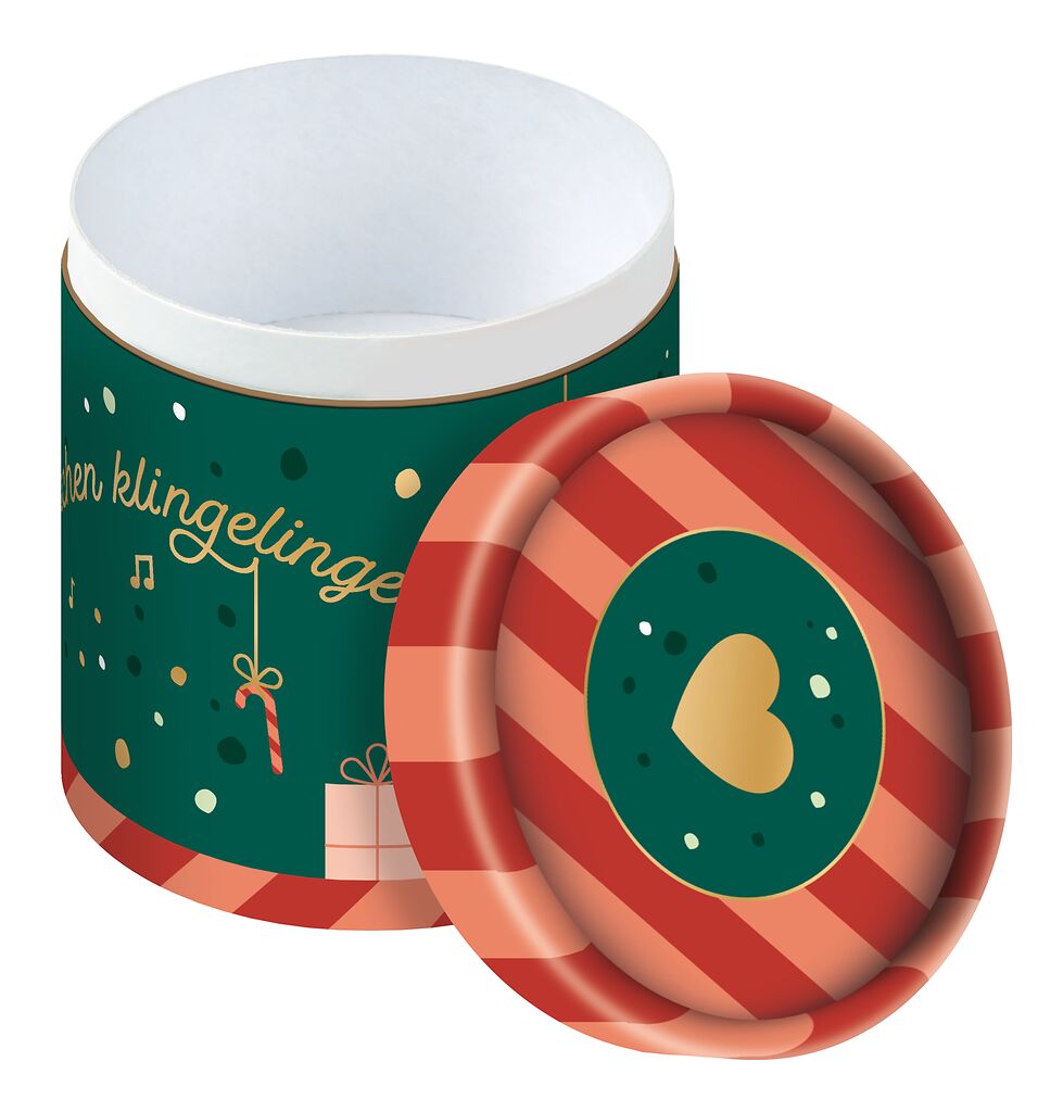 Die Gutschein-Spieluhrdose verbindet festliche Stimmung mit einer liebevollen Geschenkidee. Im integrierten Geheimfach finden Gutscheine oder kleine Geldgeschenke stilvoll Platz. Einfach aufziehen – schon erklingt eine der klassischen Melodien "Kling, Glöckchen" oder "O Tannenbaum" und sorgt für weihnachtliche Vorfreude. Das festliche Design mit glänzender Goldfolienveredelung macht die Dose zu einem echten Blickfang.