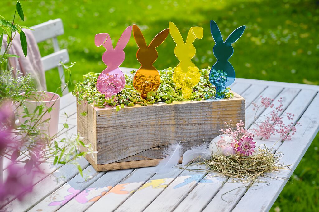 Diese fröhlichen Hasen-Stecker aus UV-beständigem Acryl setzen leuchtende Akzente in jedem Beet, Pflanztopf oder Blumenkasten. Die kräftigen Farben und das stilvolle Design machen sie zu einem echten Hingucker für die Osterzeit.