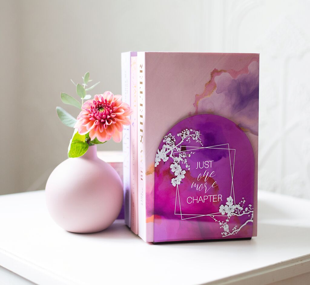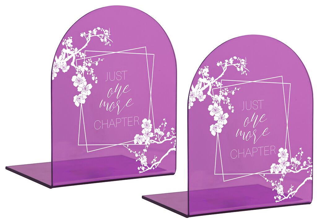 Die Buchstützen im stylischen Acryl-Design bringen Ordnung ins Regal und setzen gleichzeitig dekorative Akzente. Mit ihrem floralen Motiv und dem dezenten Schriftzug „Just one more chapter" laden sie zum Weiterlesen ein – ein schönes Detail für alle, die Bücher lieben.