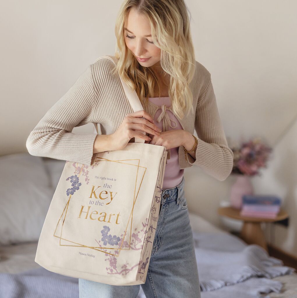 Dieser Shopper im Buchformat begeistert mit einem Design, das an ein edles Hardcover erinnert. Der poetische Aufdruck „The key to the heart" sowie zarte florale Details machen ihn zu einem besonderen Hingucker – ob beim Stadtbummel, im Buchladen der auf dem Weg zur Bibliothek. Dank des stabilen Bodens und der festen Baumwolle eignet sich die Tasche wunderbar für Bücher und mehr. Ein Must-have für alle, die Geschichten lieben.