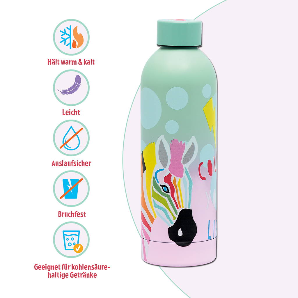 Die Lovely Planet Isolierflasche hält Getränke bis zu 12 Stunden warm oder 15 Stunden kalt. Dank der doppelwandigen Edelstahlkonstruktion ist sie robust, auslaufsicher und bruchfest – ideal für den Alltag, Ausflüge oder das Büro. Auch für kohlensäurehaltige Getränke geeignet. Das farbenfrohe Design mit Zebra-Motiv und das kleine Herz auf dem Deckel machen die Flasche zu einem echten Hingucker.
