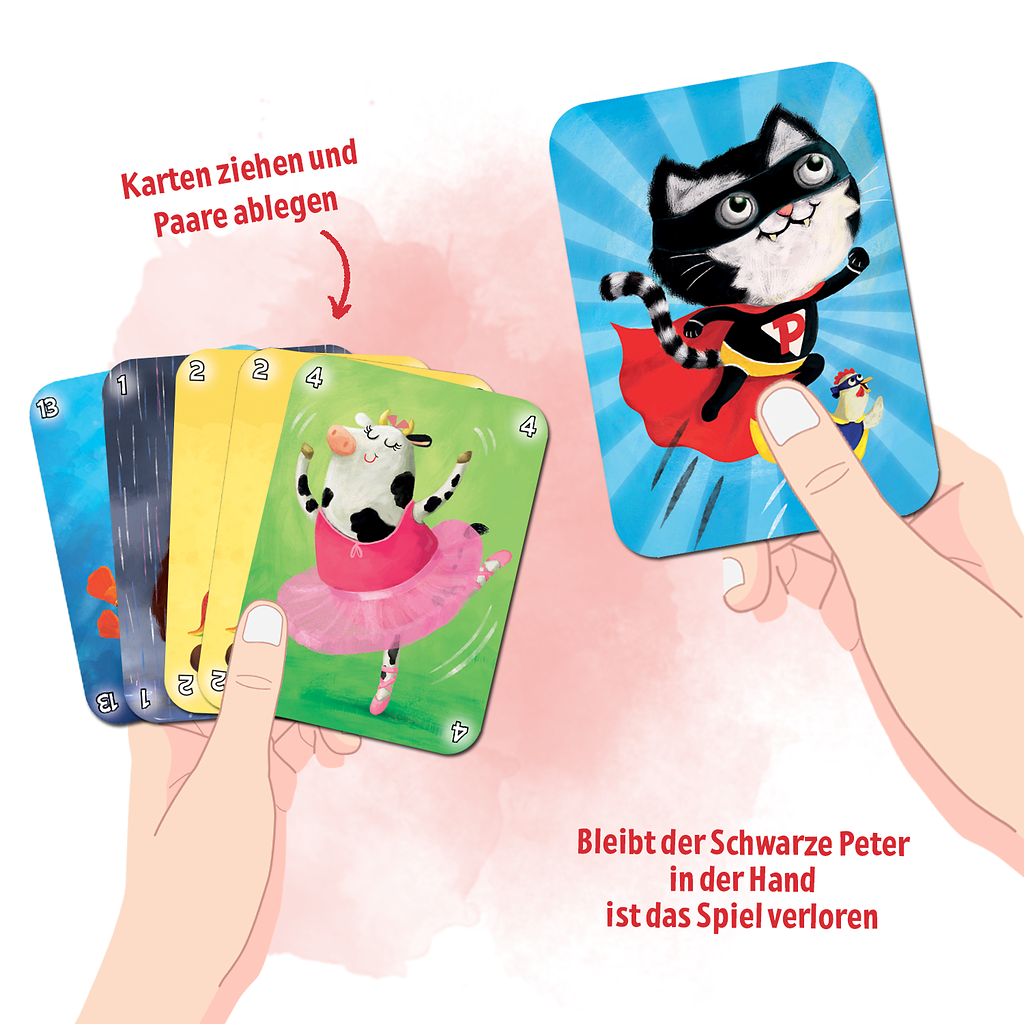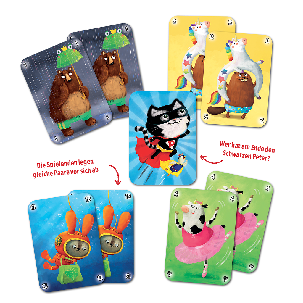 Die Spieler legen gleiche Paare vor sich ab. Reihum ziehen die Spieler Karten von Mitspielern. Wer den Schwarzen Peter zum Schluss hat, verliert.