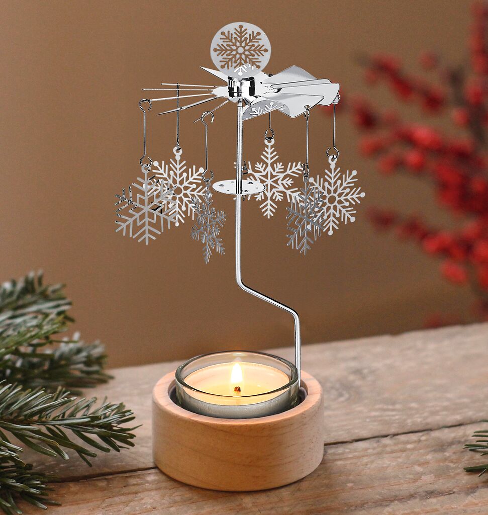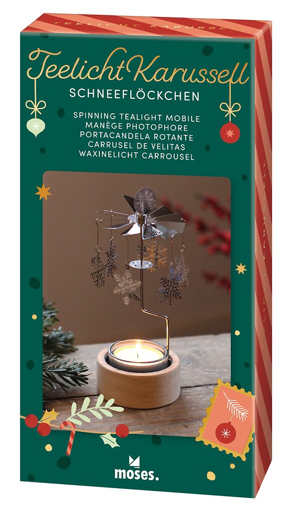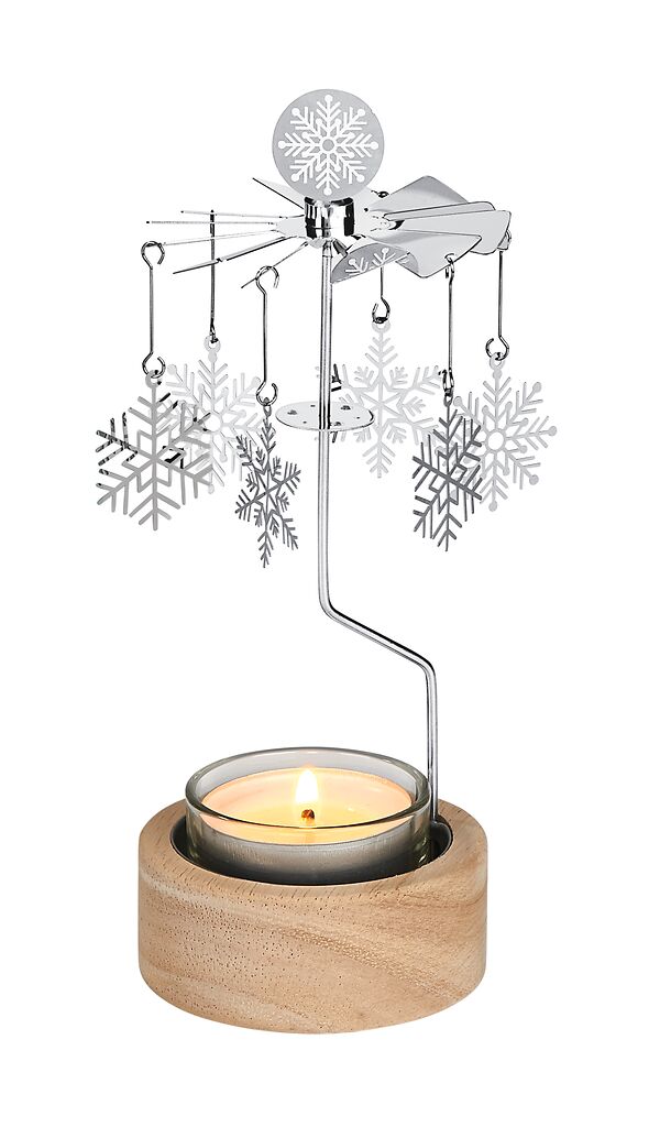 Gemütliche Stimmung an dunklen Winterabenden ist mit diesem Teelicht-Karussell garantiert! Das Karussell spendet wohlig-warmes Licht und zaubert dank der sich drehenden Metall-Anhänger in Schneeflöckchen-Form funkelnde Lichtreflexe in dem Raum. Das stilvolle Teelicht-Mobile mit Teelichtglas und Holz-Sockel ist durch die einfache Stecktechnik im Handumdrehen einsatzbereit und macht sich hervorragend als winterliche Deko in dein eigenen vier Wänden.