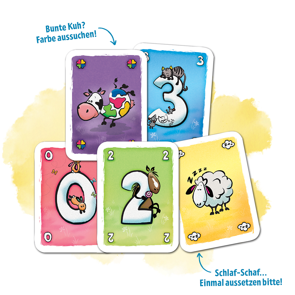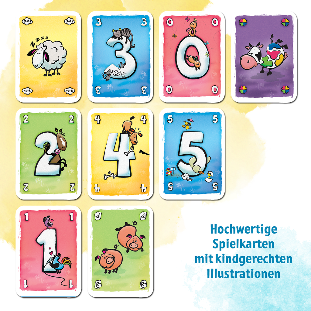 Den Spiele-Klassiker gibt es jetzt auch in einer Variante extra für Kinder ab 5 Jahren. Das kindlich-bunte Design sorgt auf jeden Fall für gute Laune bei den Jüngsten und die aufgedruckten Bauernhoftiere erhöhen den Spaßfaktor. So erlaubt die bunte Kuh einen Farbwechsel, wohingegen das Schlaf-Schaf dafür sorgt, dass man eine Runde aussetzen muss.