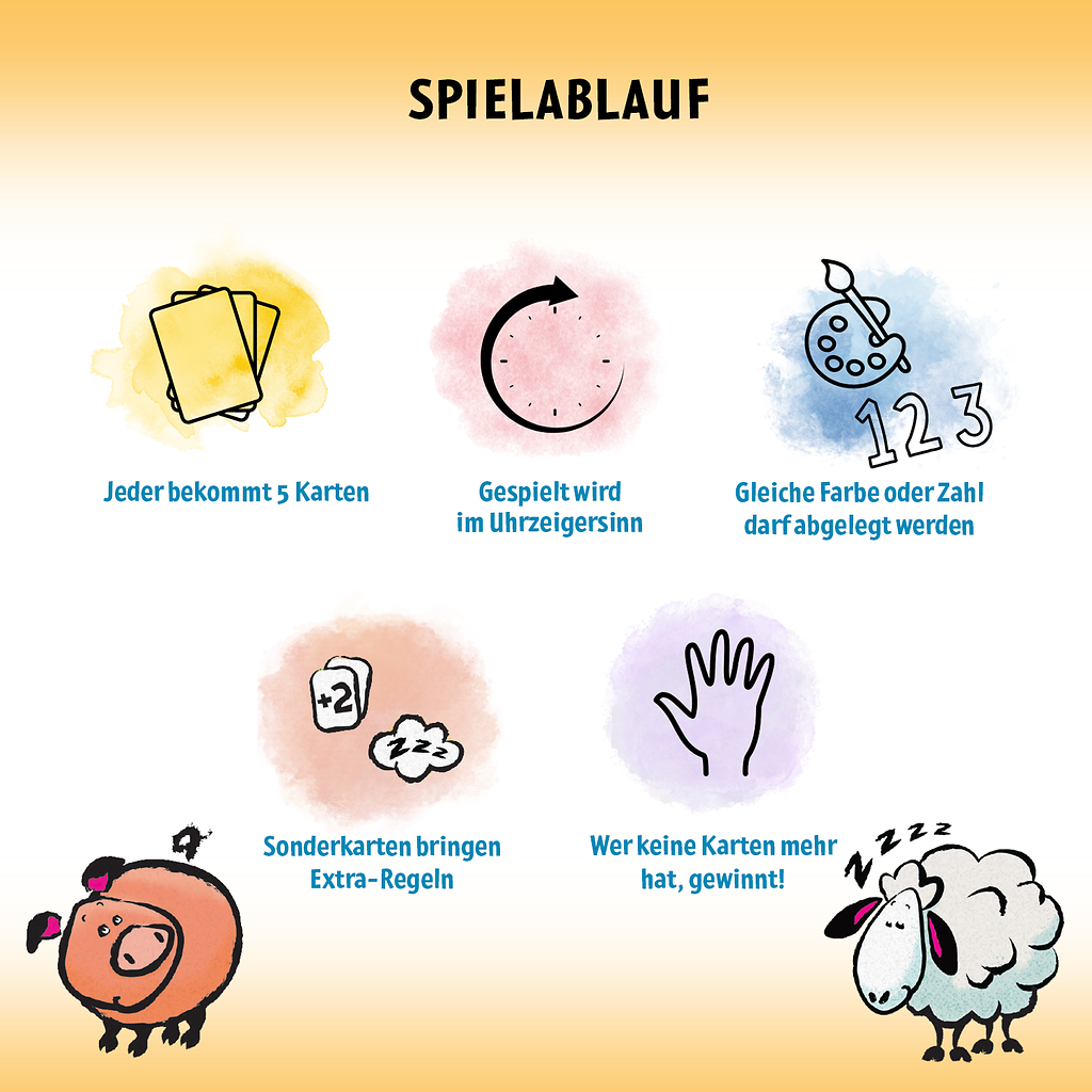 Die Regeln sind im wahrsten Sinn des Wortes kinderleicht: Jeder hat 5 Karten auf der Hand und versucht, diese so schnell wie möglich loszuwerden. Es dürfen reihum Karten mit der gleichen Farbe oder der gleichen Zahl auf den Ablagestapel gelegt werden. Verschiedene Sonderkarten, wie die +2, der Richtungswechsel und das Aussetzen sorgen für doppelten Spielspaß und bringen den ein oder anderen ganz schön ins Schwitzen. Dann kann der spannende Wettkaampf ja beginnen - wer wird wohl als Erster seine Karten los?