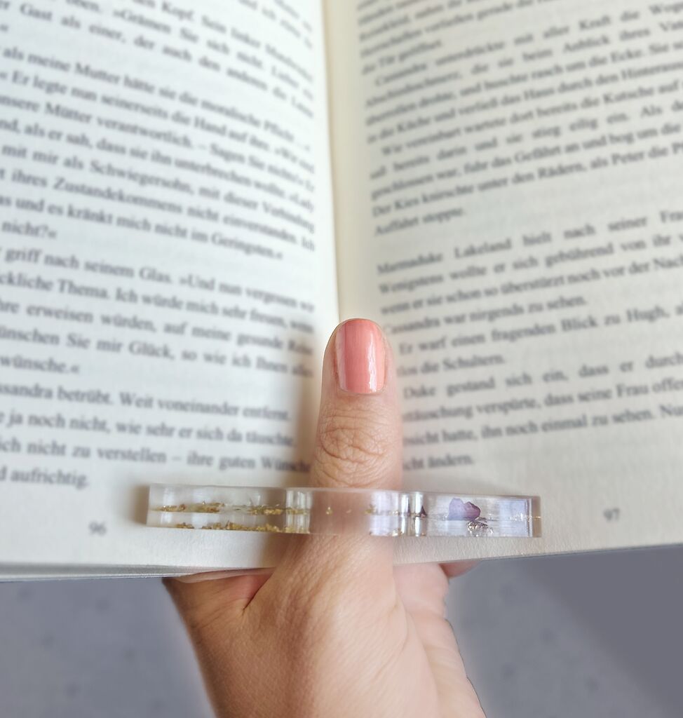 Der Lesedaumen sorgt für einen stabilen und sicheren Halt der geöffneten Buchseiten, ohne dass sie ständig mit den Fingern fixiert werden müssen. Besonders praktisch beim Lesen mit nur einer Hand – etwa unterwegs, beim Lesen am Strand oder auf dem Sofa. Eingegossene Trockenblumen machen jedes Exemplar zu einem dekorativen Einzelstück, das nicht nur nützlich, sondern auch schön anzusehen ist.